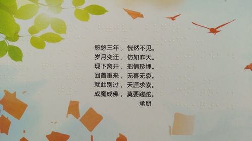 一個架子上,放著一疊厚實的精裝冊子,封面寫著“2018屆貳家紀(jì)念冊”。翻開冊子,與以往見到的一樣,紙面印著一張張燦爛而純真的笑臉和一些文字,不一樣的是,紙面上還多了一些微微凸起圓點,大約厚度1mm左右,按一種特有的規(guī)律排列,看起來晶瑩剔透,用手撫摸一下,顆粒感很真實,這就是“盲文畢業(yè)紀(jì)念冊”。